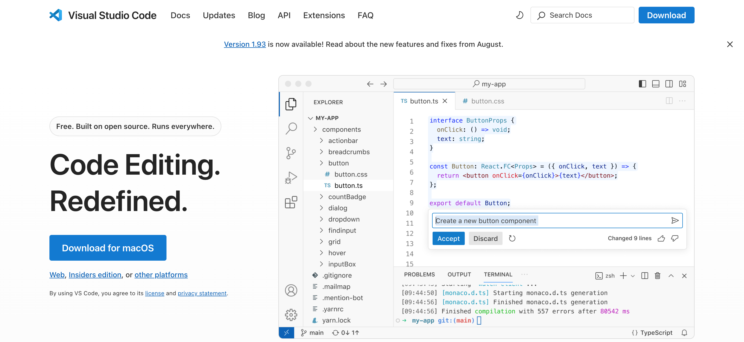 VSCode(Visual Studio Code)是微软开发的一款开源编辑器。官网地址 https://code.visualstudio.com/ (opens new window)。